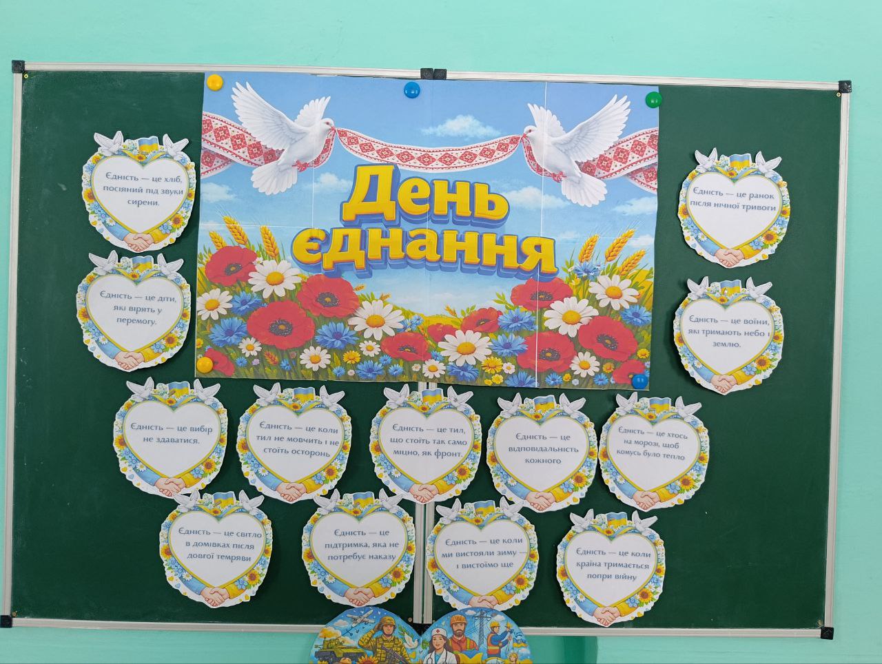 У коридорі гімназії оформлено тематичну АРТ-стіну «Єдність у наших серцях», де розміщено короткі гасла та вислови учнів про те, що для них означає єдність.